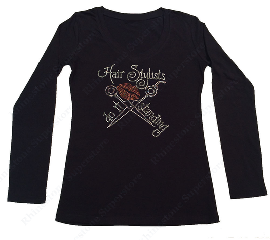 Womens T-shirt with Hair Stylists Do It Standing in Rhinestones