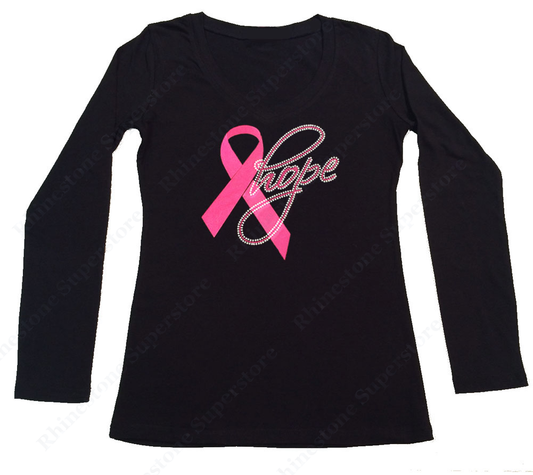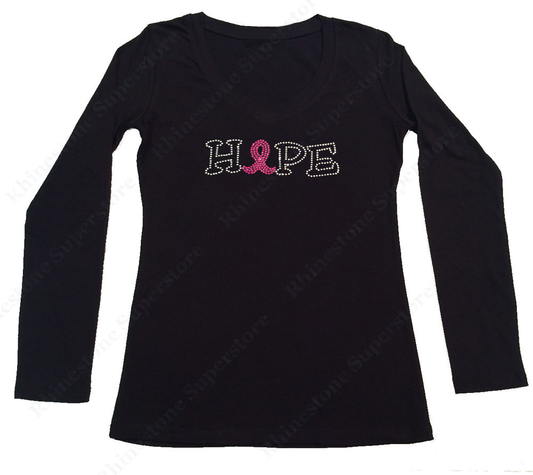 Womens T-shirt with Pink Hope Cancer Ribbon in Rhinestones