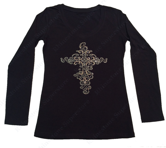 Womens T-shirt with Silver and Pearl Cross in Rhinestones