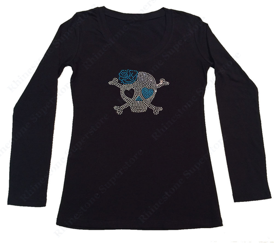 Womens T-shirt with Skull with Blue Rose in Rhinestones