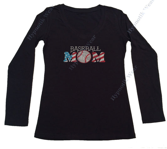 Womens T-shirt with Patriotic Baseball Mom in Rhinestones