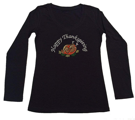 Womens T-shirt with Cooked Happy Thanksgiving in Rhinestones