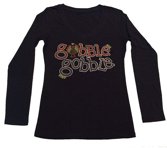 Womens T-shirt with Girl with Gobble Gobble Thanksgiving in Rhinestones