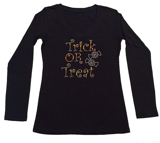 Womens T-shirt with Trick or Treat with Candy in Rhinestones