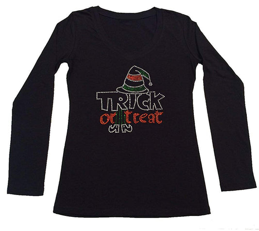 Womens T-shirt with Trick or Treat with Witch Hat in Rhinestones