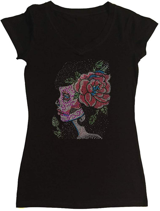 Women's / Unisex T-Shirt with Colorful Sugar Skull with Rose in Rhinestuds