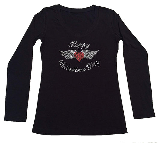 Womens T-shirt with Happy Valentine's Day Heart with Wings in Rhinestones