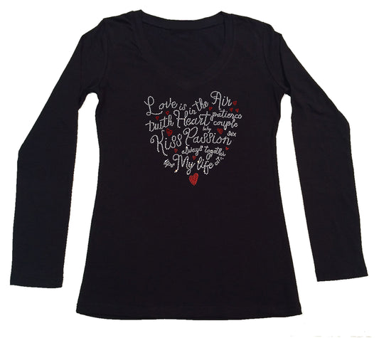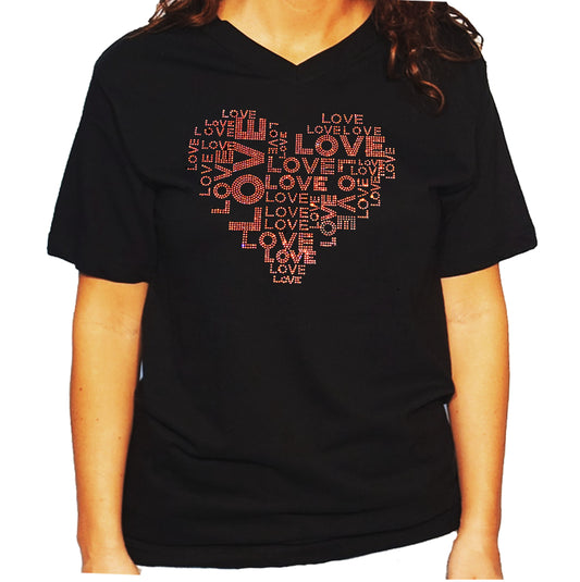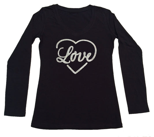 Womens T-shirt with Love Saying Heart in Rhinestones