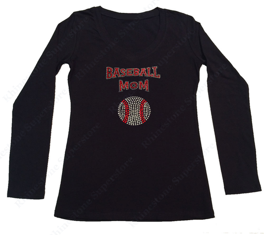 Womens T-shirt with Red Baseball Mom in Rhinestones