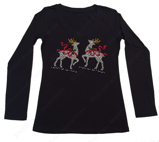Womens T-shirt with Cute Christmas Reindeer in Rhinestones