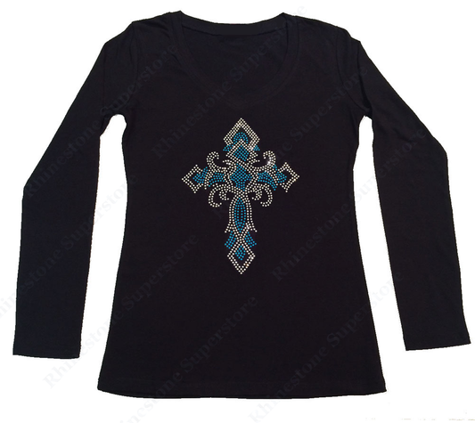 Womens T-shirt with Turquoise Twisted Cross in Rhinestones