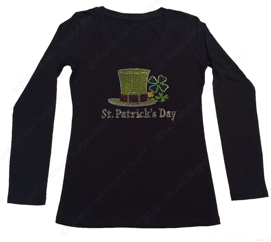 Womens T-shirt with Saint Patrick's Day Top Hat with Clover Leaves in Rhinestones