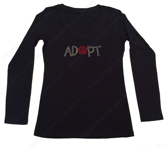 Womens T-shirt with Adopt with Red Paw in Rhinestones