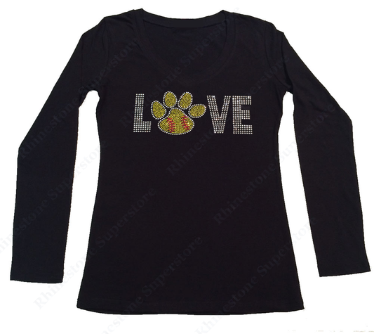Womens T-shirt with Love Softball Paw in Rhinestones