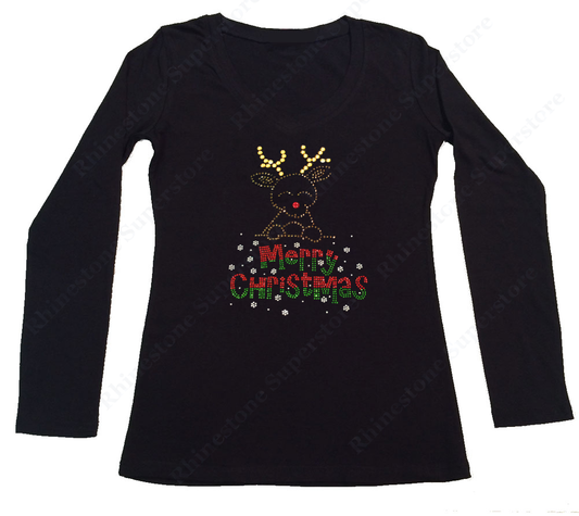 Womens T-shirt with Merry Christmas Rudolph the Red Nosed Reindeer in Rhinestones