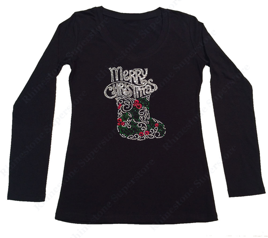 Womens T-shirt with Merry Christmas with Stocking in Rhinestones