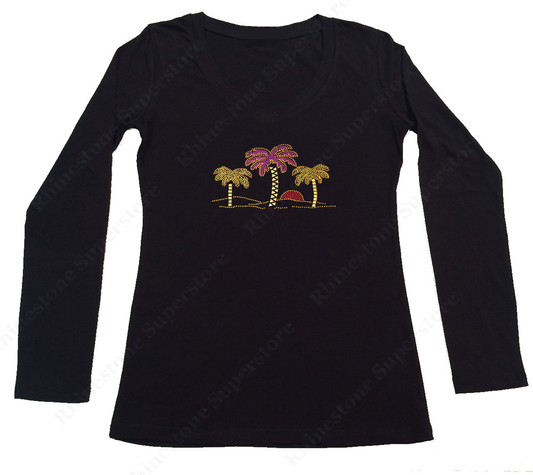 Womens T-shirt with Palm Trees and Sunset in Rhinestuds