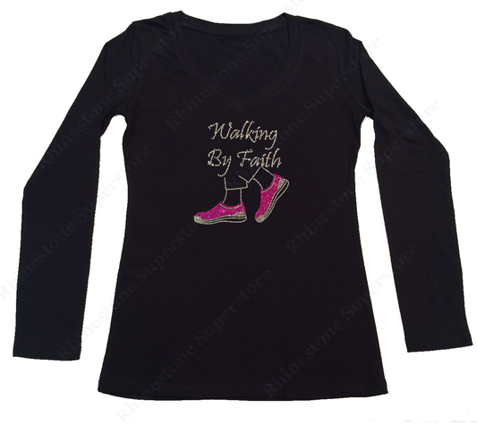 Womens T-shirt with Walking by Faith Pink Shoes in Rhinestones