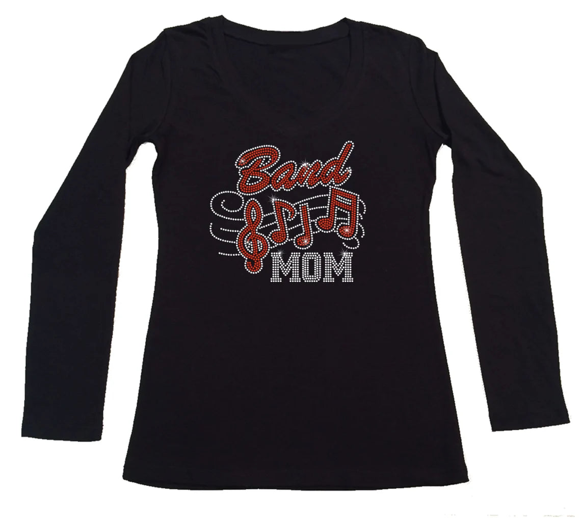 This is for Women's Rhinestone Fitted Tight Snug Shirt with “ Band Mom & Music Notes - Band Shirt " made in Rhinestones with a choice of V-Neck in Cap Sleeve or Long Sleeve Styles or Ribbed Razorback Tank Top.