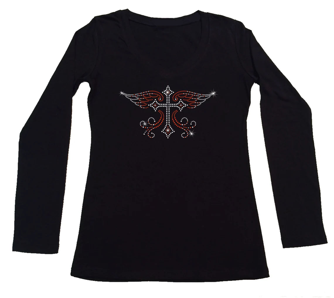 Women's Rhinestone Fitted Tight Snug Cross with Wings - Rhinestone Church shirt, Red Cross