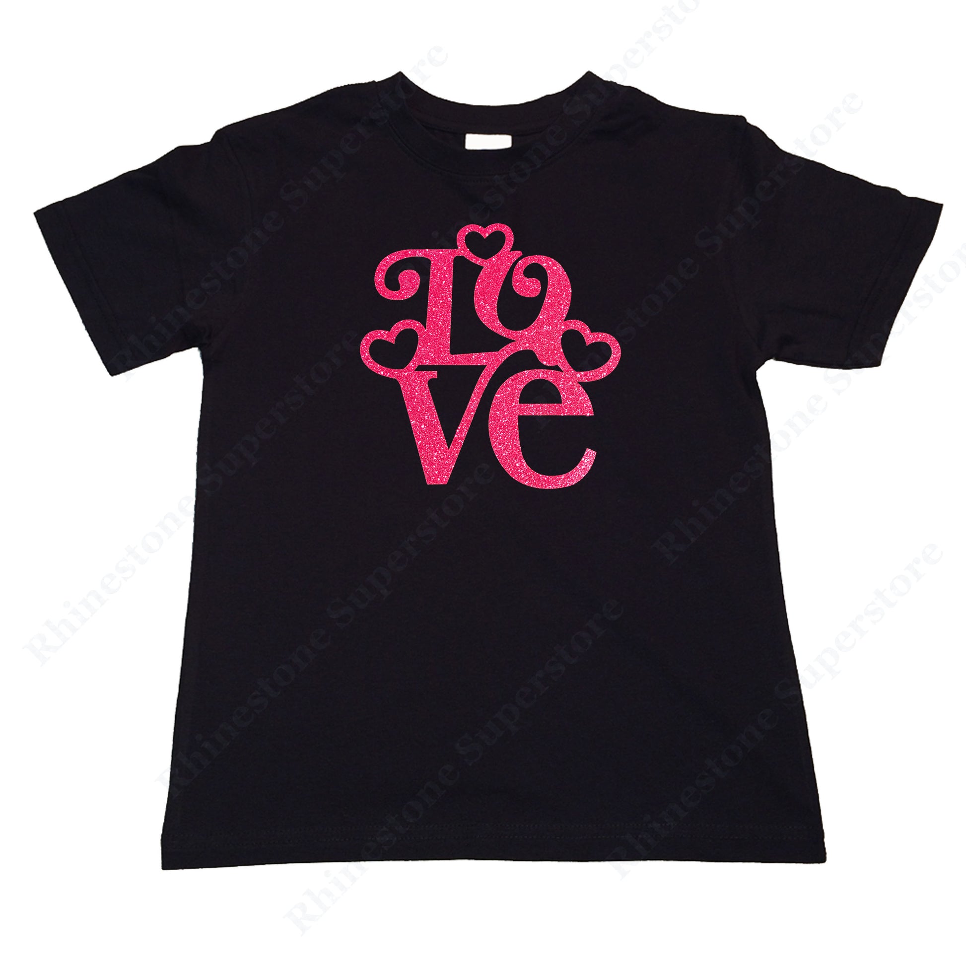 Girls Rhinestone T-Shirt " Love with Hearts in Pink Glitters " Kids Size 3 to 14 Available