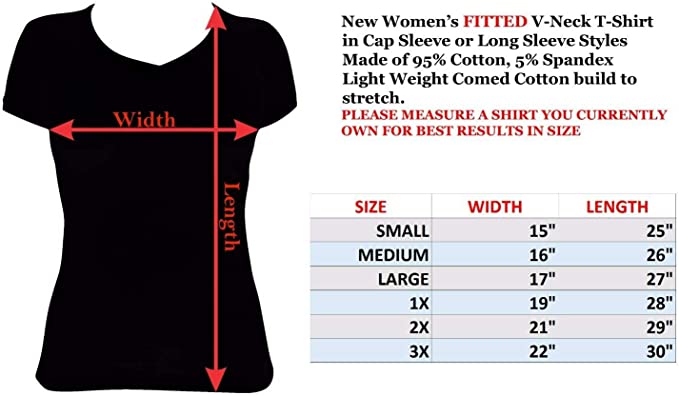 Size Specifications for V-Neck in Cap Sleeve and Long Sleeve Styles are as follows: