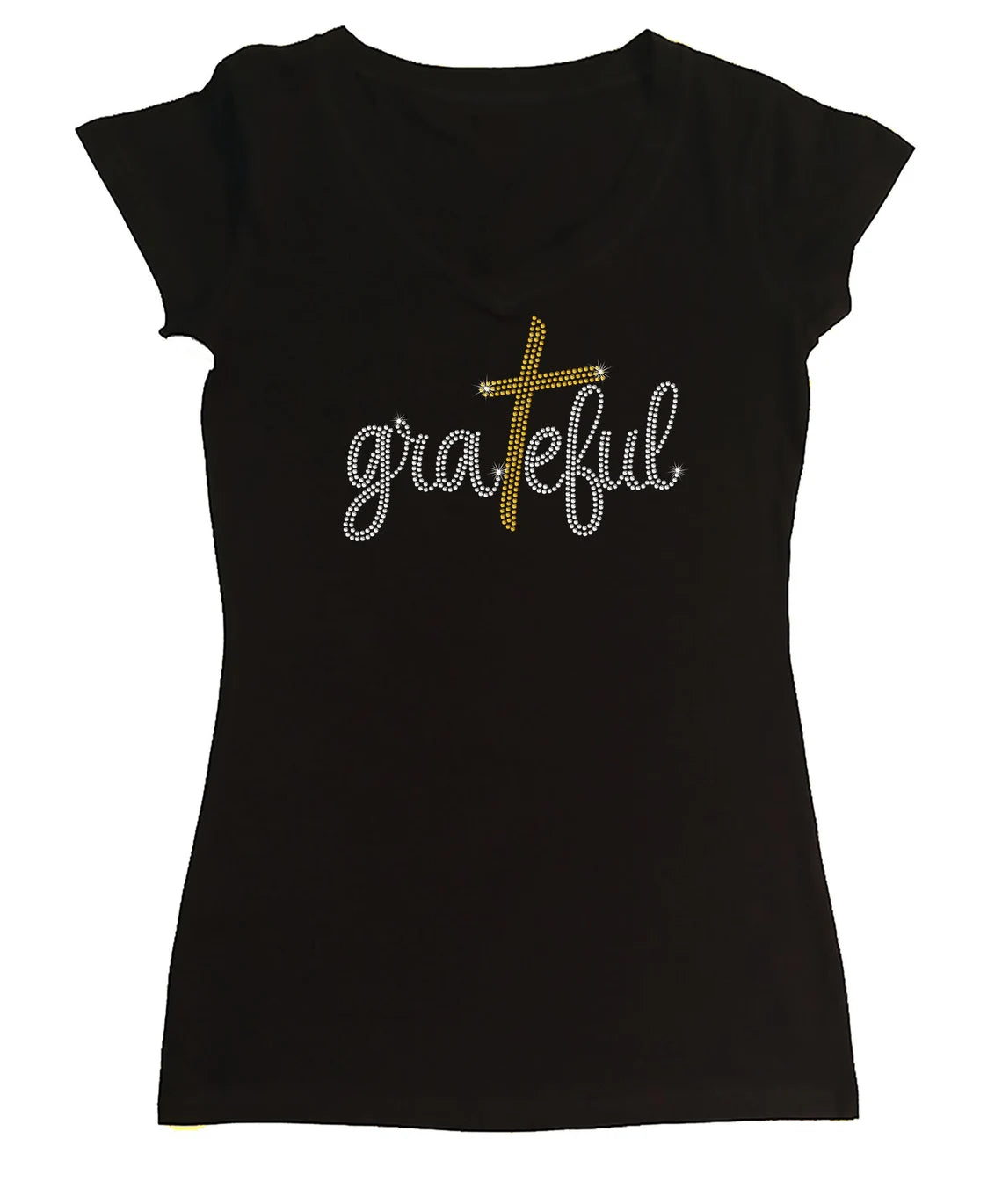 Women's Rhinestone Fitted Tight Snug Grateful with Cross in Script - Rhinestone Church shirt