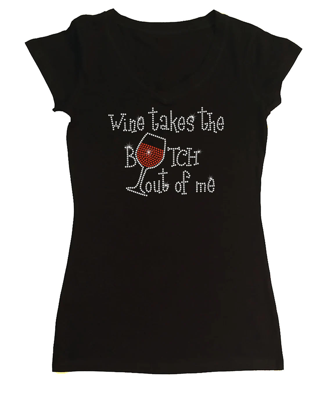 This is for Women's Rhinestone Fitted Tight Snug Shirt with “ Wine Takes the Bitch Out of Me - for Wine Tasting, Girls Trip, Wine shirt " made in Rhinestones with a choice of V-Neck in Cap Sleeve or Long Sleeve Styles or Ribbed Razorback Tank Top.