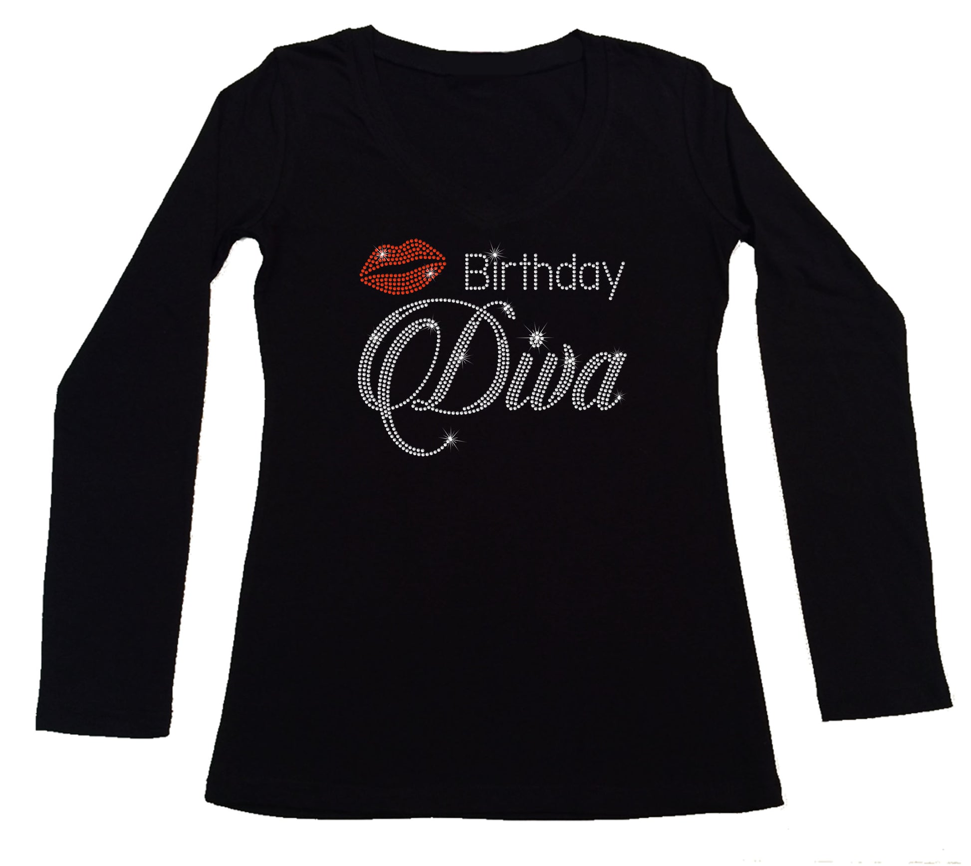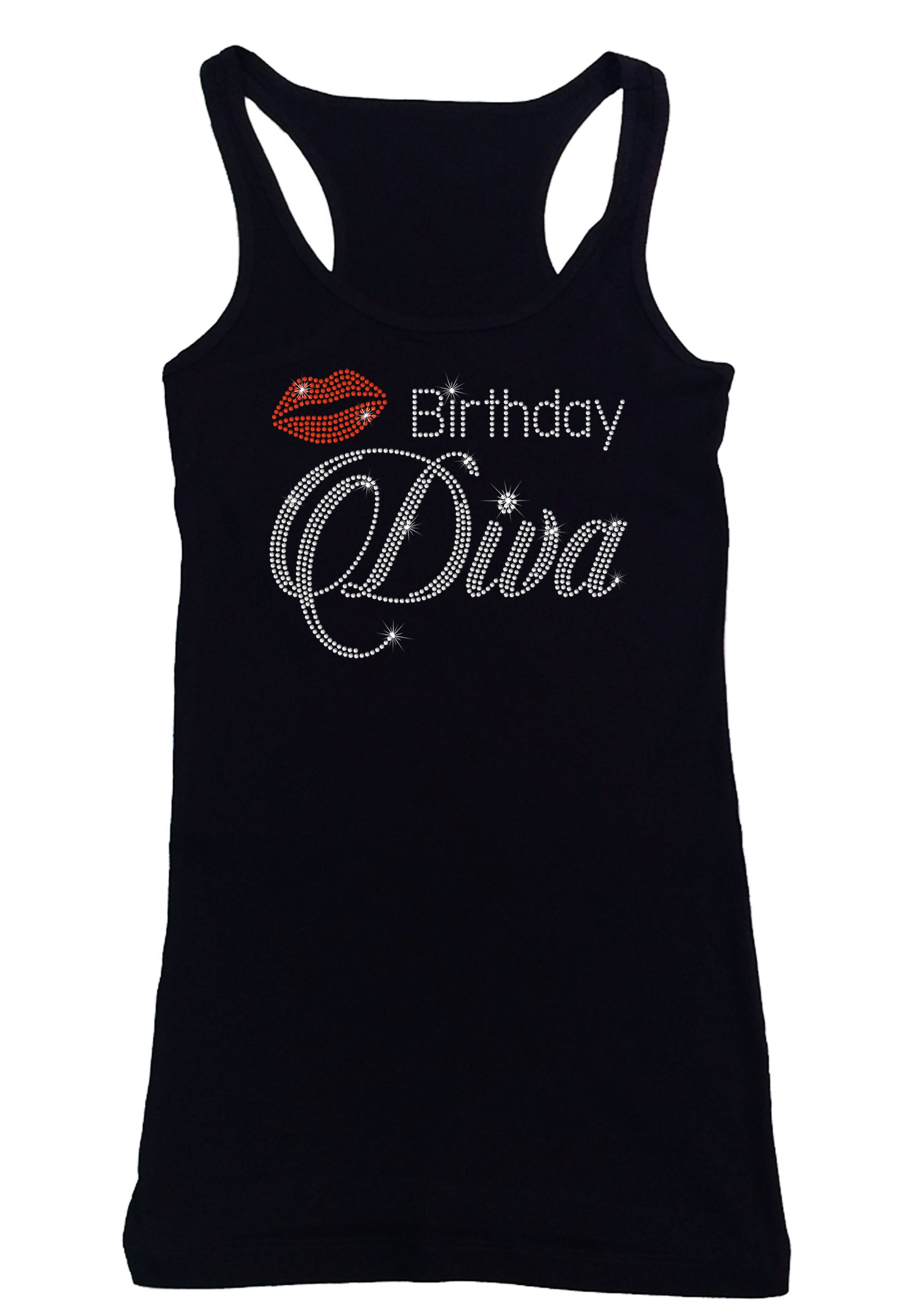 This is for Women's Rhinestone Fitted Tight Snug Shirt with “ Birthday Diva with Red Lips - Rhinestone Birthday Shirt " made in Rhinestones with a choice of V-Neck in Cap Sleeve or Long Sleeve Styles or Ribbed Razorback Tank Top.