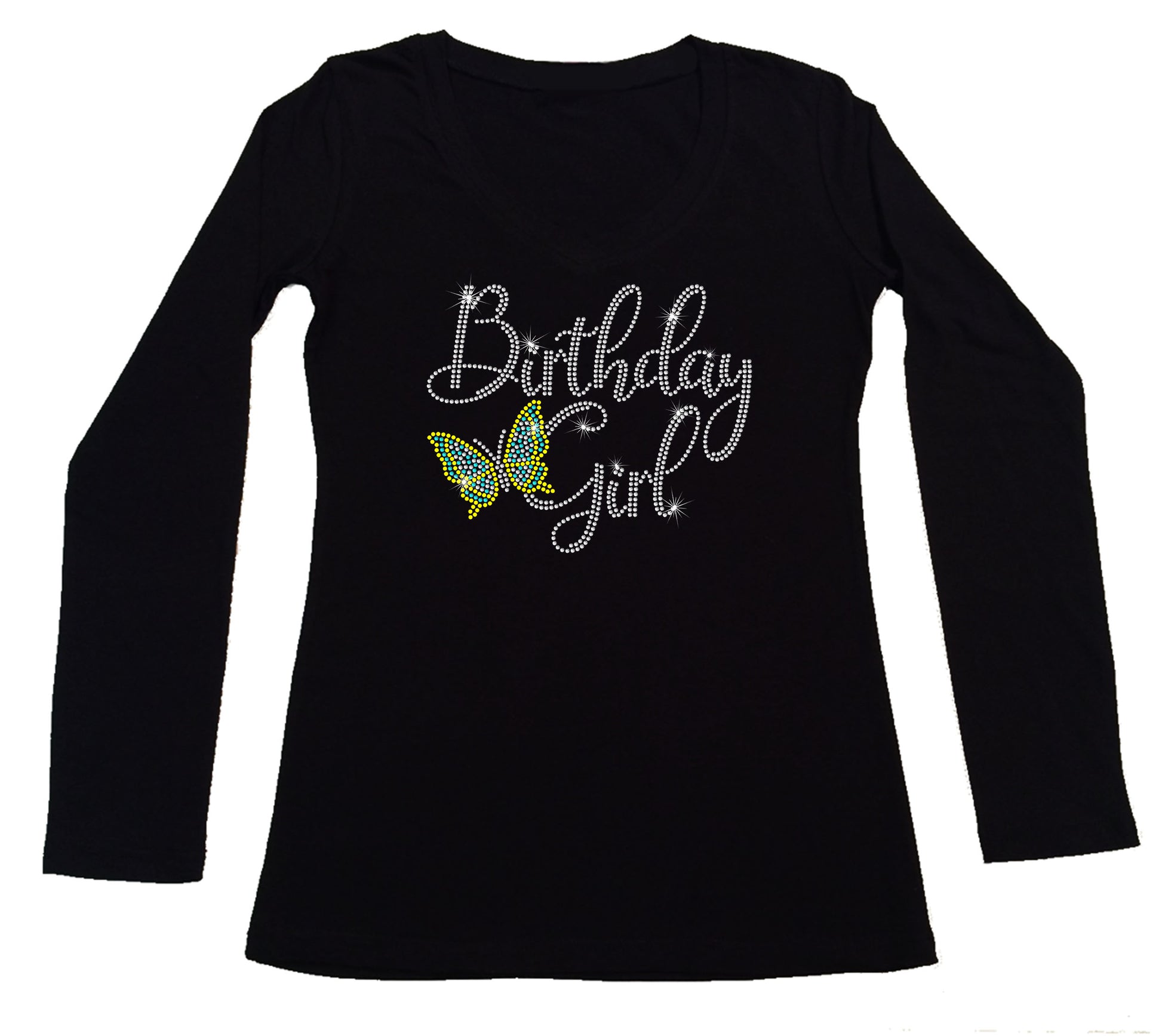 This is for Women's Rhinestone Fitted Tight Snug Shirt with “ Birthday Girl with Butterfly - Rhinestone Birthday Shirt " made in Rhinestones with a choice of V-Neck in Cap Sleeve or Long Sleeve Styles or Ribbed Razorback Tank Top.