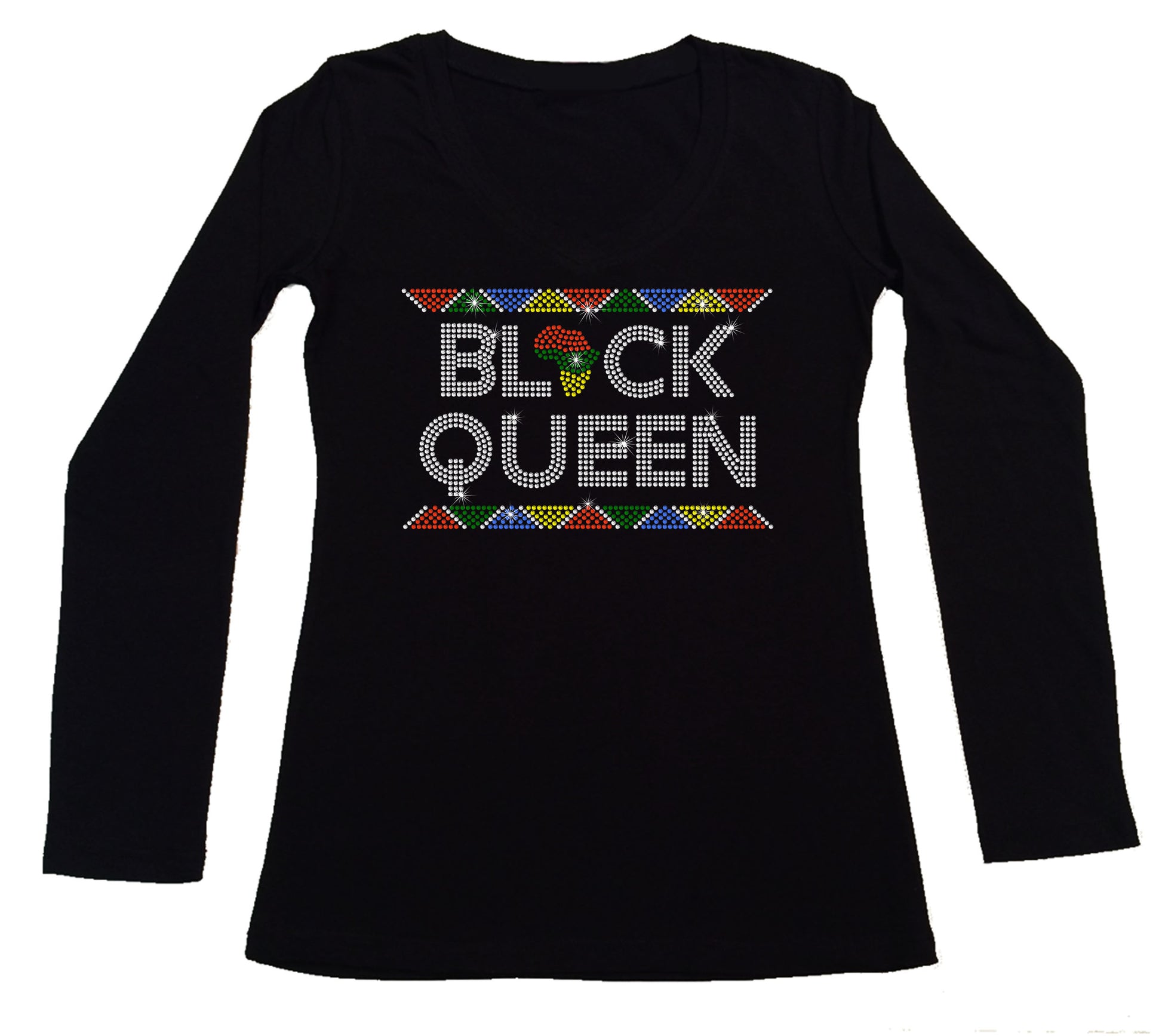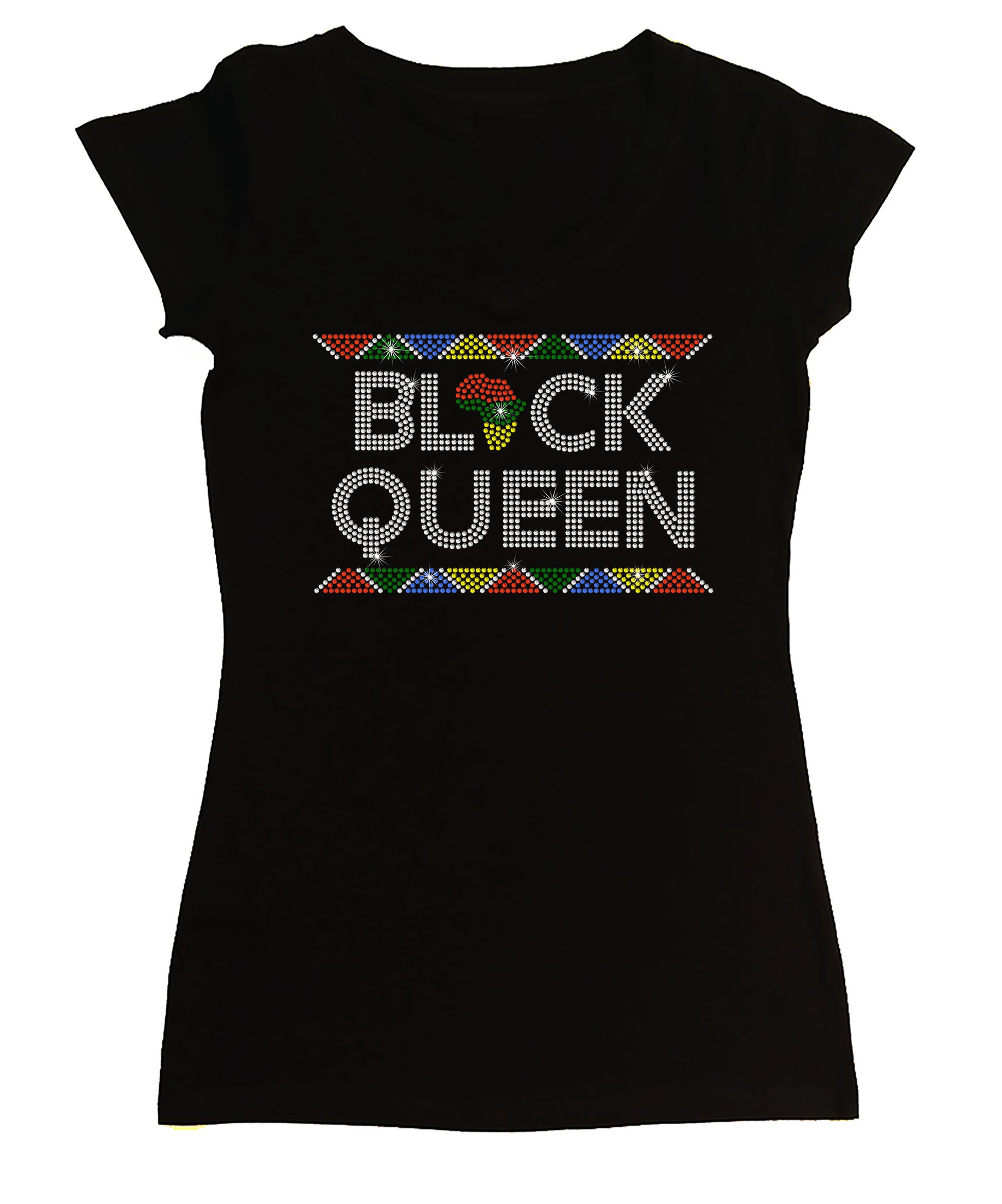 This is for Women's Rhinestone Fitted Tight Snug Shirt with “ Black Queen - in African Colors Border Rhinestone Shirt " made in Rhinestones with a choice of V-Neck in Cap Sleeve or Long Sleeve Styles or Ribbed Razorback Tank Top.