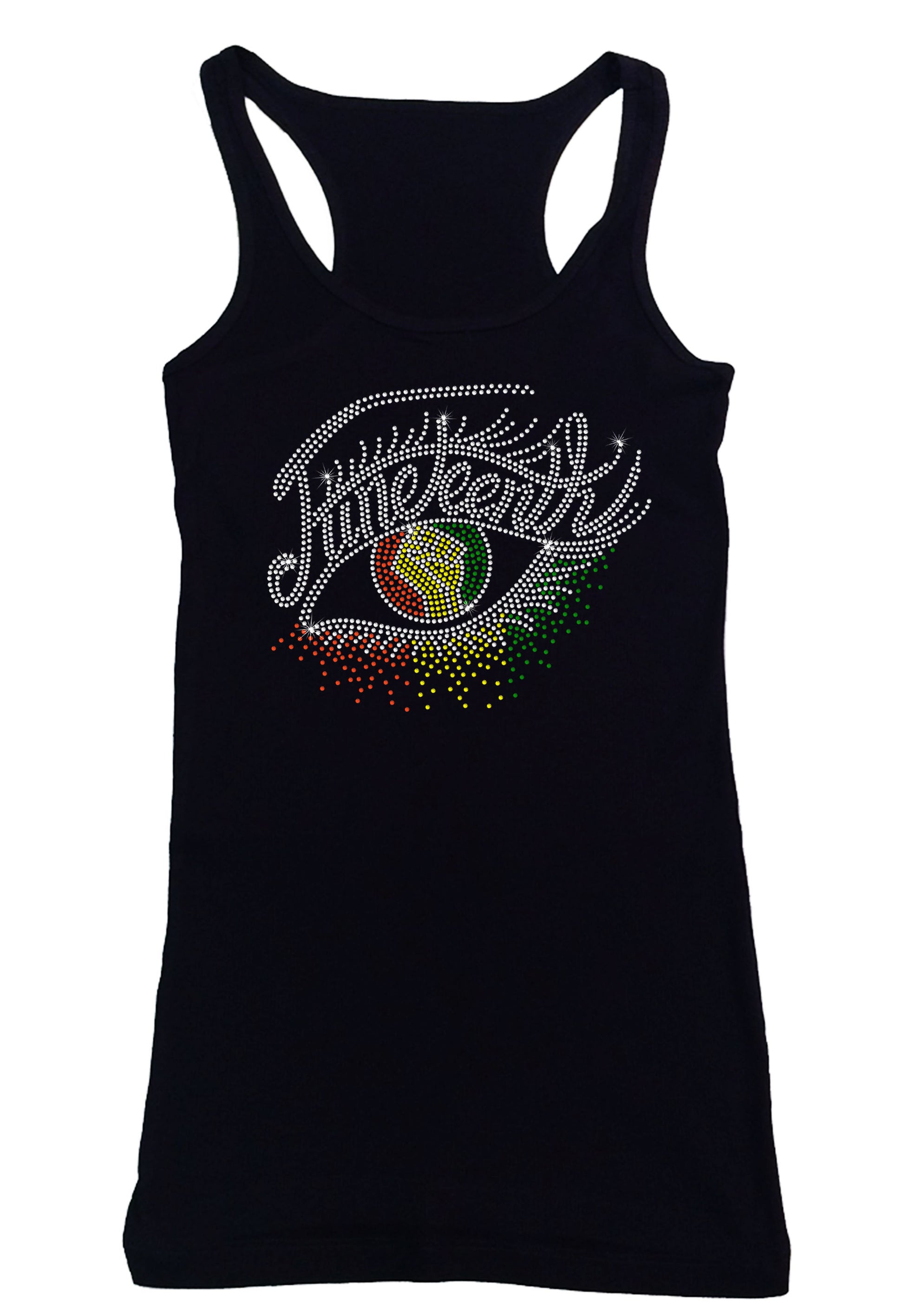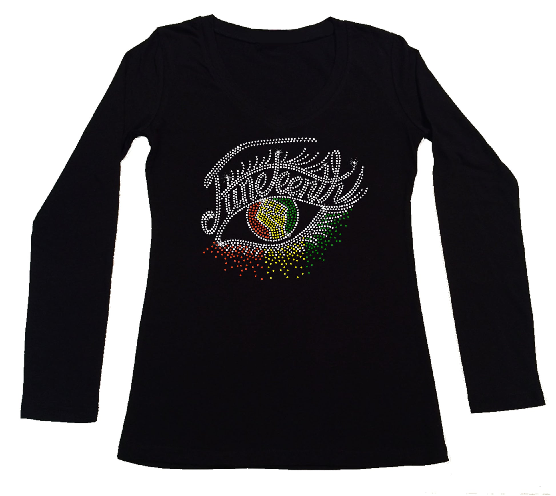 This is for Women's Rhinestone Fitted Tight Snug Shirt with “ Juneteenth Eye with Lashes - Fist, Free-ish, 1865, Juneteenth Shirt " made in Rhinestones with a choice of V-Neck in Cap Sleeve or Long Sleeve Styles or Ribbed Razorback Tank Top.