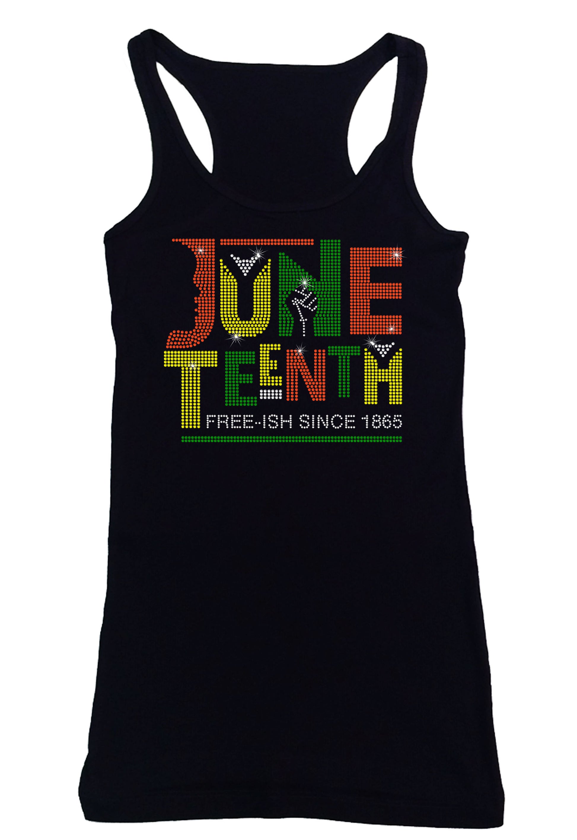 This is for Women's Rhinestone Fitted Tight Snug Shirt with “ Juneteenth Free-ish Since 1865 - Juneteenth Shirt with Fist " made in Rhinestones with a choice of V-Neck in Cap Sleeve or Long Sleeve Styles or Ribbed Razorback Tank Top.