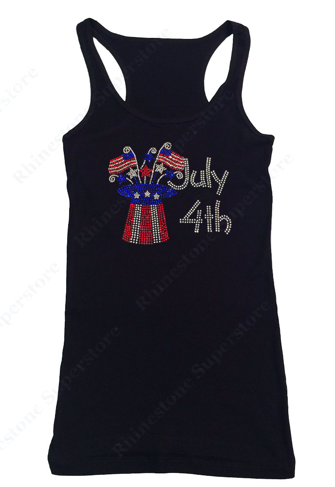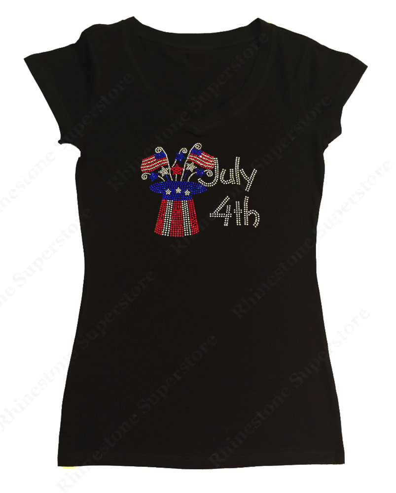 This is for New Women's Fitted T-Shirt embellished with “ 4th of July Top Hat " made in Rhinestones with a choice of V-Neck in Cap Sleeve or Long Sleeve Styles or Ribbed Razorback Tank Top.