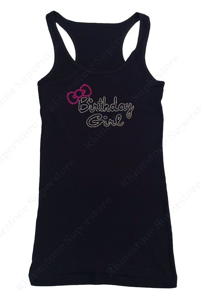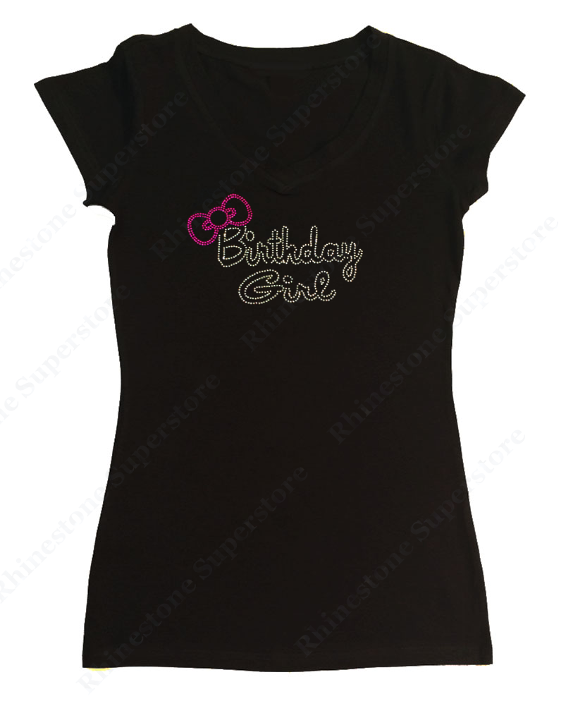 This is for New Women's Fitted T-Shirt embellished with “ Birthday Girl with Pink Bow " made in Rhinestones with a choice of V-Neck in Cap Sleeve or Long Sleeve Styles or Ribbed Razorback Tank Top.