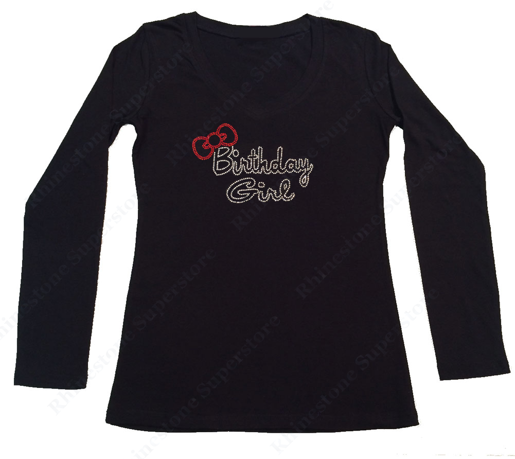 This is for New Women's Fitted T-Shirt embellished with “ Birthday Girl with Red Bow " made in Rhinestones with a choice of V-Neck in Cap Sleeve or Long Sleeve Styles or Ribbed Razorback Tank Top.