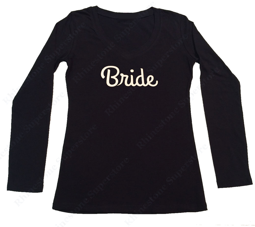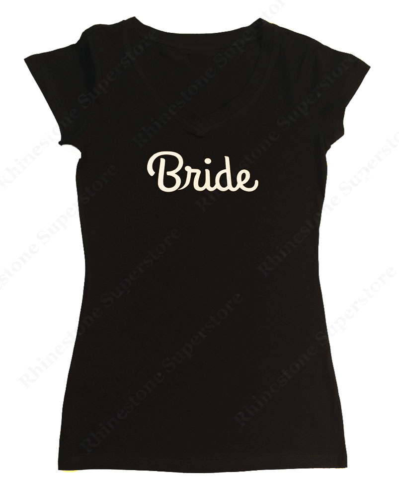 This is for New Women's Fitted T-Shirt embellished with “ Bride " made in Glitter Print with a choice of V-Neck in Cap Sleeve or Long Sleeve Styles or Ribbed Razorback Tank Top.