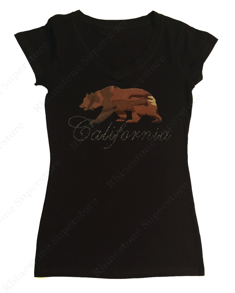 This is for New Women's Fitted T-Shirt embellished with “ California Bear " made in Camo and Rhinestuds with a choice of V-Neck in Cap Sleeve or Long Sleeve Styles or Ribbed Razorback Tank Top.