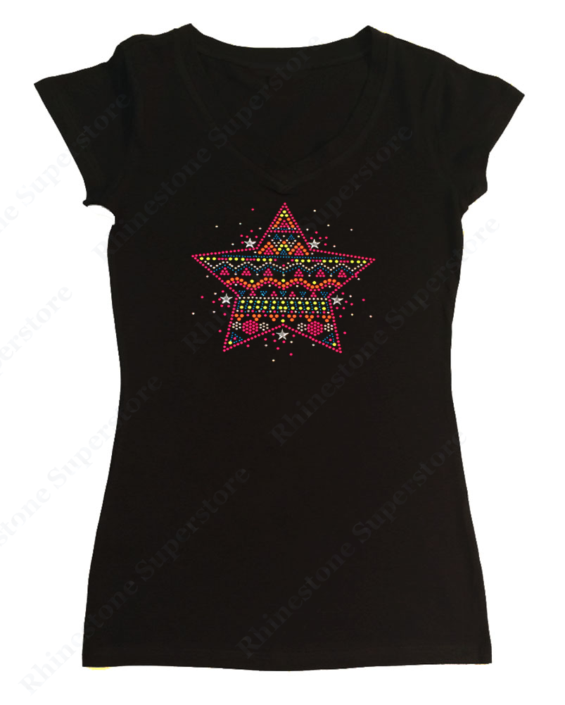 Womens T-shirt with Colorful Neon Star in Rhinestuds