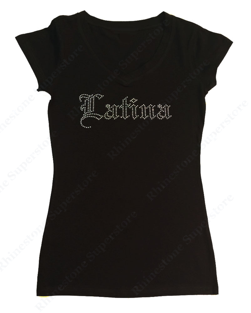Womens T-shirt with Crystal Latina in Old English in Rhinestones