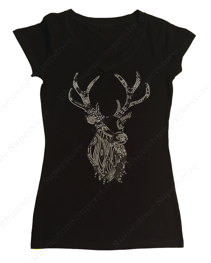 This is for New Women's Fitted T-Shirt embellished with “ Deer " made in Rhinestuds and Nail Heads with a choice of V-Neck in Cap Sleeve or Long Sleeve Styles or Ribbed Razorback Tank Top.