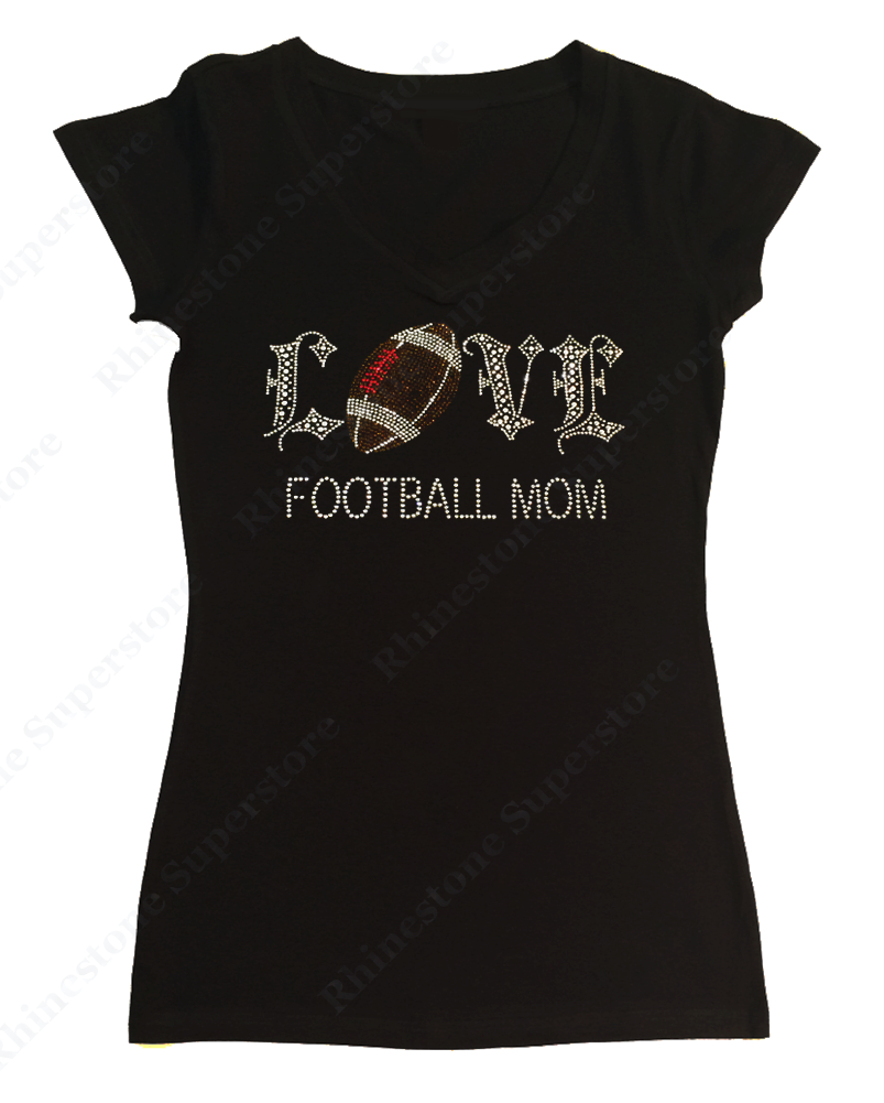 This is for New Women's Fitted T-Shirt embellished with “ Football Mom Love " made in Rhinestones with a choice of V-Neck in Cap Sleeve or Long Sleeve Styles or Ribbed Razorback Tank Top.