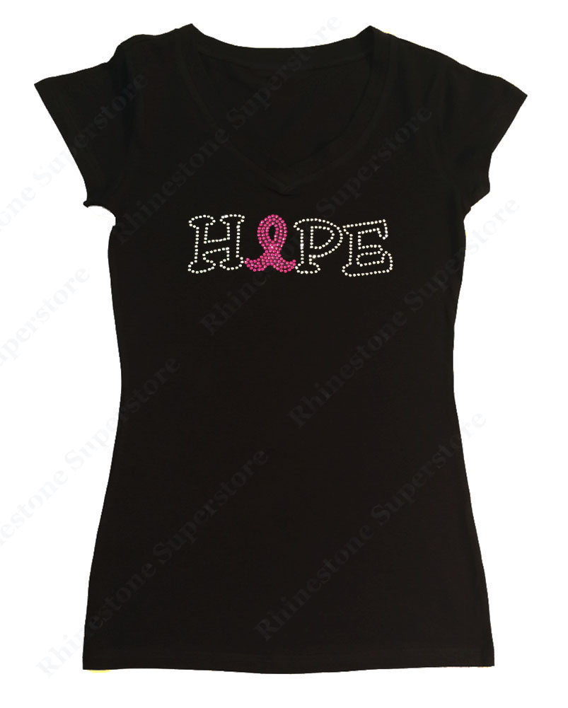 Womens T-shirt with Hope Cancer Ribbon in Rhinestones