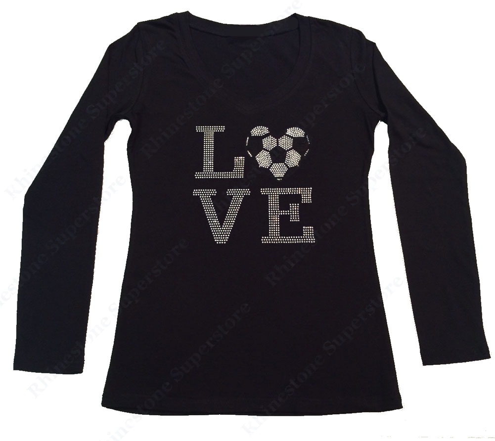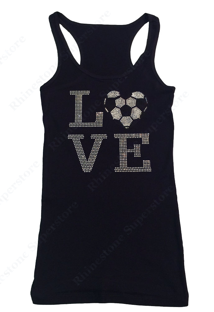 This is for New Women's Fitted T-Shirt embellished with “ Love Soccer Ball Heart " made in Rhinestones with a choice of V-Neck in Cap Sleeve or Long Sleeve Styles or Ribbed Razorback Tank Top.
