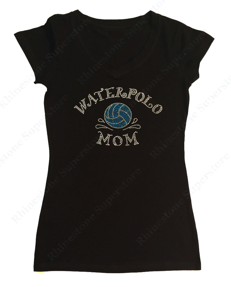 This is for New Women's Fitted T-Shirt embellished with “ Lt. Blue Ball Waterpolo Mom " made in Rhinestones with a choice of V-Neck in Cap Sleeve or Long Sleeve Styles or Ribbed Razorback Tank Top.