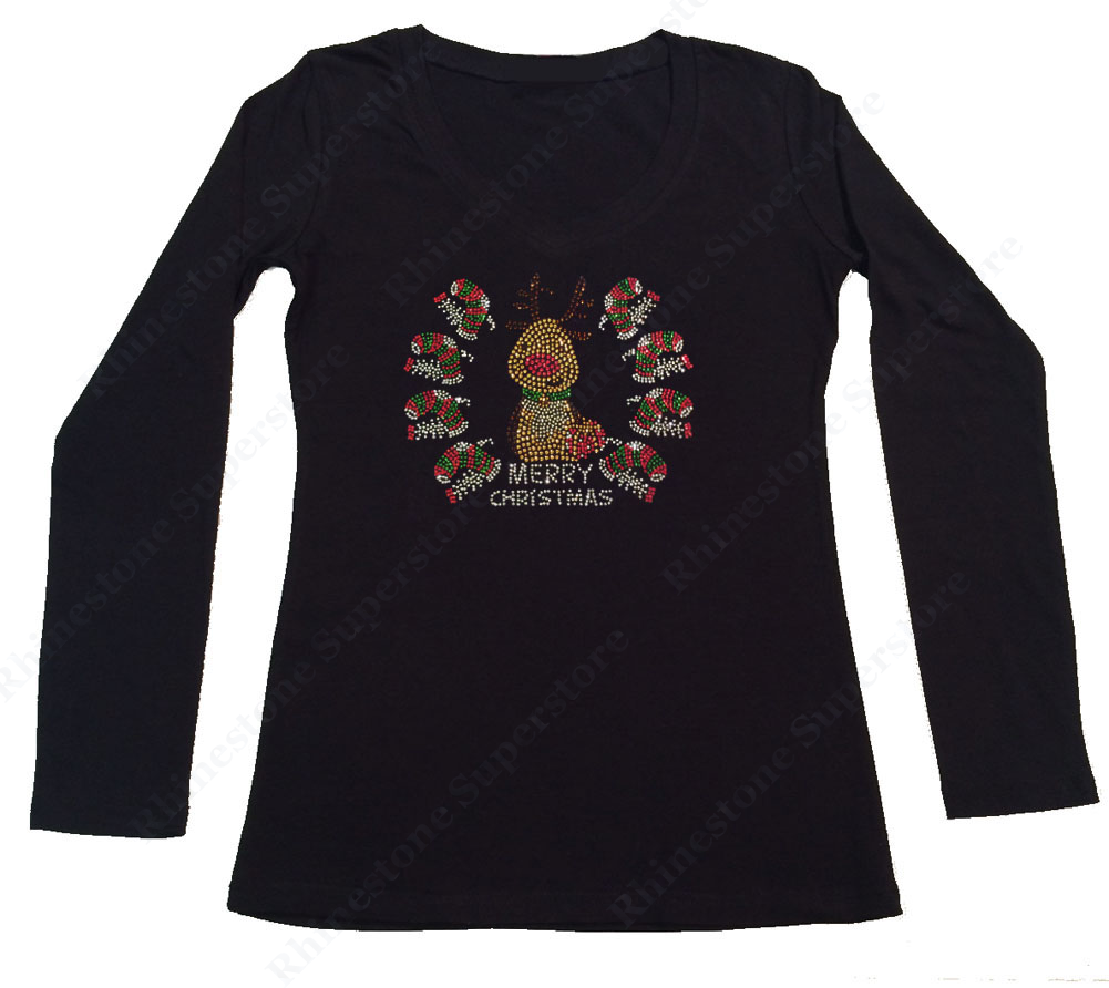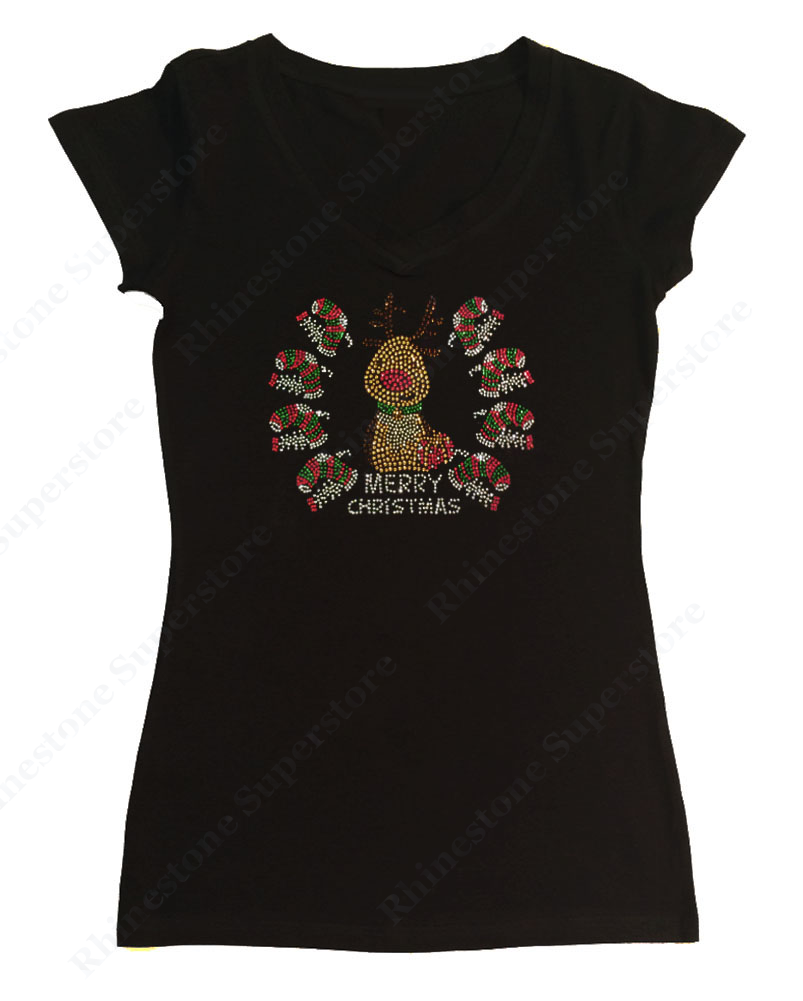 Womens T-shirt with Merry Christmas Reindeer in Rhinestones