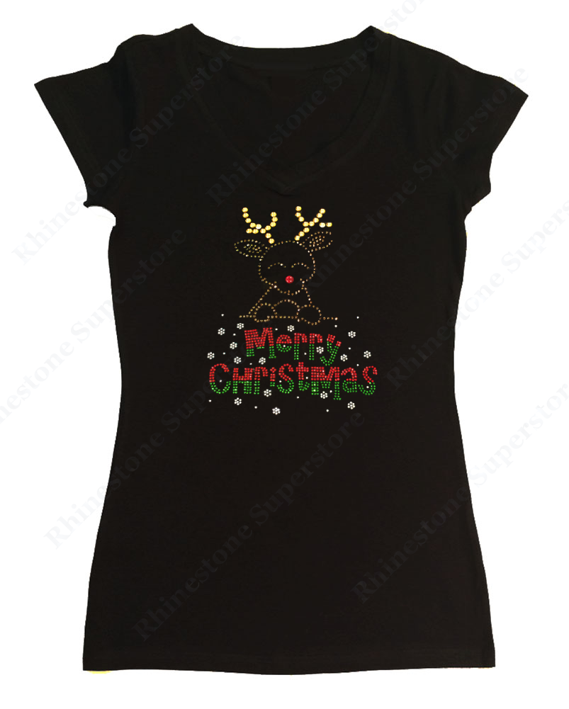 Womens T-shirt with Merry Christmas Rudolph the Red Nosed Reindeer in Rhinestones