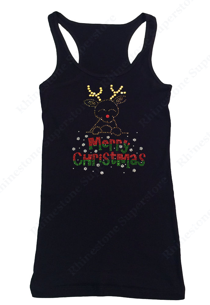 This is for New Women's Fitted T-Shirt embellished with “ Merry Christmas Rudolph the Red Nosed Reindeer " made in Rhinestones with a choice of V-Neck in Cap Sleeve or Long Sleeve Styles or Ribbed Razorback Tank Top.