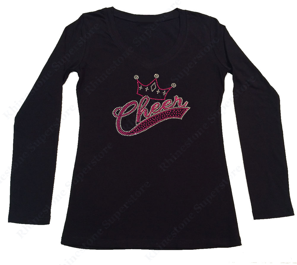 This is for New Women's Fitted T-Shirt embellished with “ Pink Cheer with Crown " made in Rhinestones with a choice of V-Neck in Cap Sleeve or Long Sleeve Styles or Ribbed Razorback Tank Top.