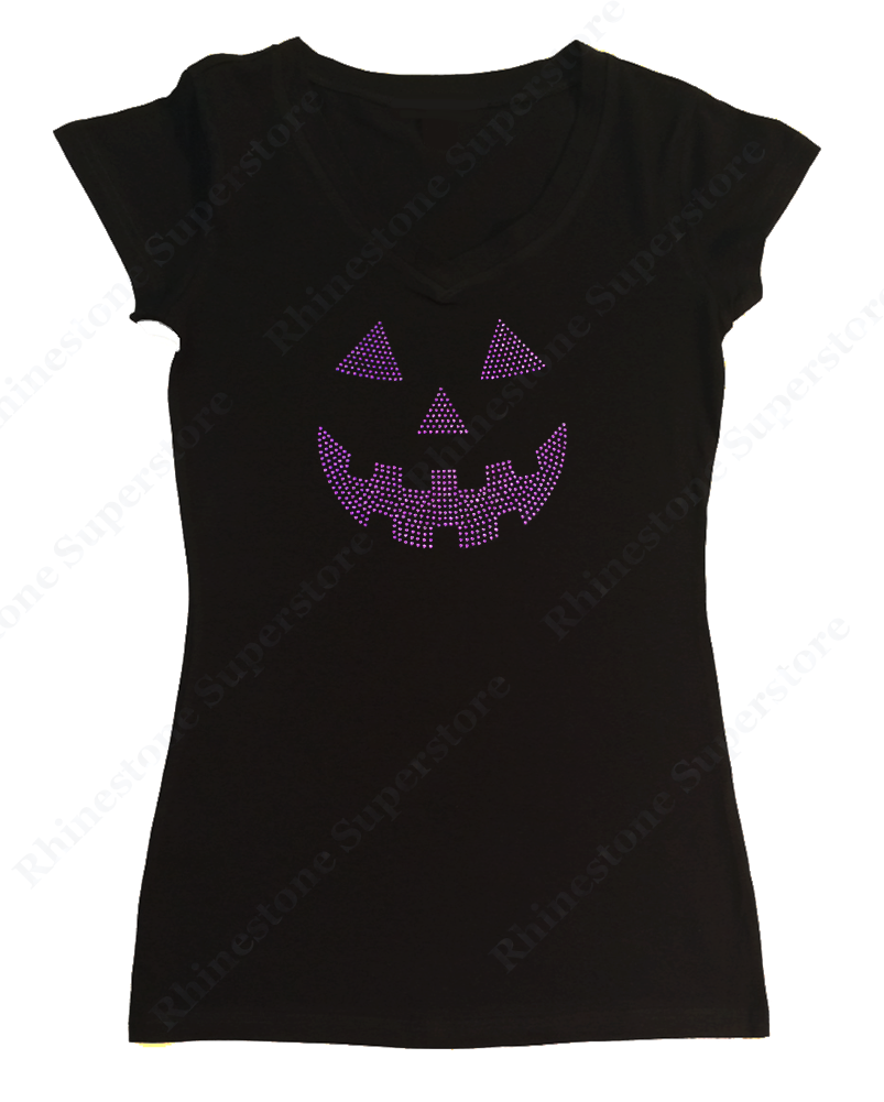 This is for New Women's Fitted T-Shirt embellished with “ Purple Jack O' Lantern " made in Rhinestones with a choice of V-Neck in Cap Sleeve or Long Sleeve Styles or Ribbed Razorback Tank Top.